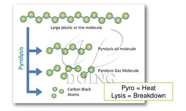 يتكون الإطار بشكل رئيسي من المطاط وأسود الكربون وأكسيد الزنك والكبريت والمكونات العضوية الأخرى. من خلال عملية الانحلال الحراري، يمكن أن تتحلل الإطارات إلى زيت الانحلال الحراري وأسود الكربون وغاز الانحلال الحراري. وعادة ما يحدث الانحلال الحراري للإطارات في بيئة مغلقة وفقيرة بالأكسجين، مع درجة حرارة تتراوح بين 400–450 درجة مئوية. وبطبيعة الحال، أنواع مختلفة من المطاط لها درجة حرارة مختلفة للتحلل الحراري. بالنسبة للمطاط الطبيعي، نظرًا لطبيعته الساخنة الضعيفة، تكون درجة حرارة الانحلال الحراري أقل. أما بالنسبة لمطاط الستايرين بوتادين ومطاط البوتادين، تكون درجة حرارة الانحلال الحراري أعلى.