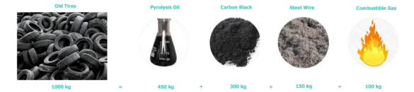 عند تدوير طن واحد من الإطارات بواسطة الانحلال الحراري نحصل على: * 450 كيلو زيت وقود يحتاج لمعالجة بسيطة ليصبح مثل وقود الديزل. * 300 كيلو أسود كربون، وبعد طحنه يصبح مادة ذات جدوى اقتصادية لاستعماله في الأصباغ للبلاستيك وغيره. * 150 كيلو جرام حديد يباع مباشرة كخردة.